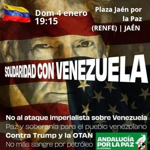 Concentración en apoyo a Venezuela contra la intervención de EEUU 4 de enero @ 19:15 Plaza Jaén por la Paz Plaza Jaén por la Paz, Jaén, Jaén, Spain